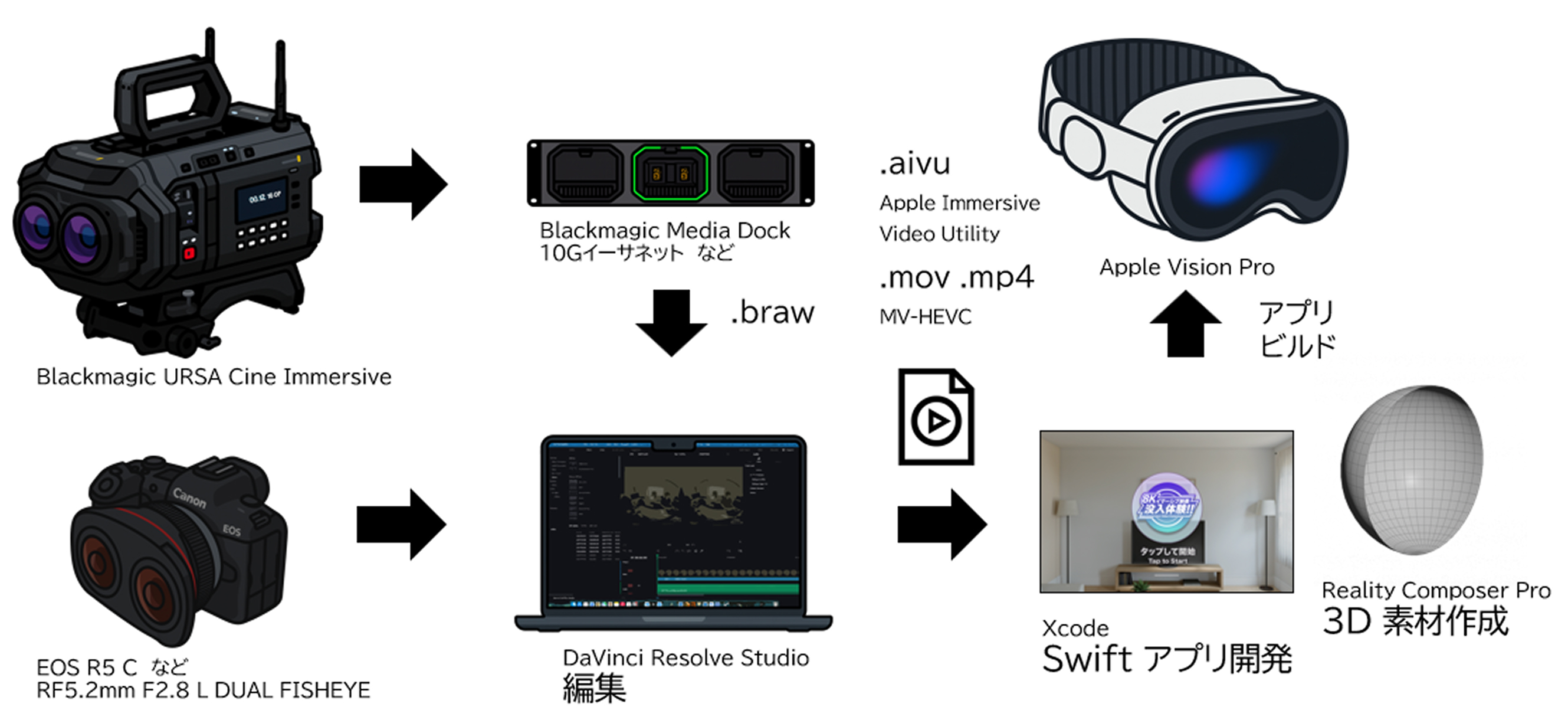 本システムは、Blackmagic URSA Cine ImmersiveカメラとApple Vision Proを中心に構成されています。8K解像度で180度3D撮影で収録した映像は、DaVinci Resolveで編集、Apple Vision Pro上のアプリで高精細かつ立体的に再生可能です。撮影から編集、Swiftによるアプリ開発まで一貫したワークフローを構築し、安定した制作・再生環境を実現しています。